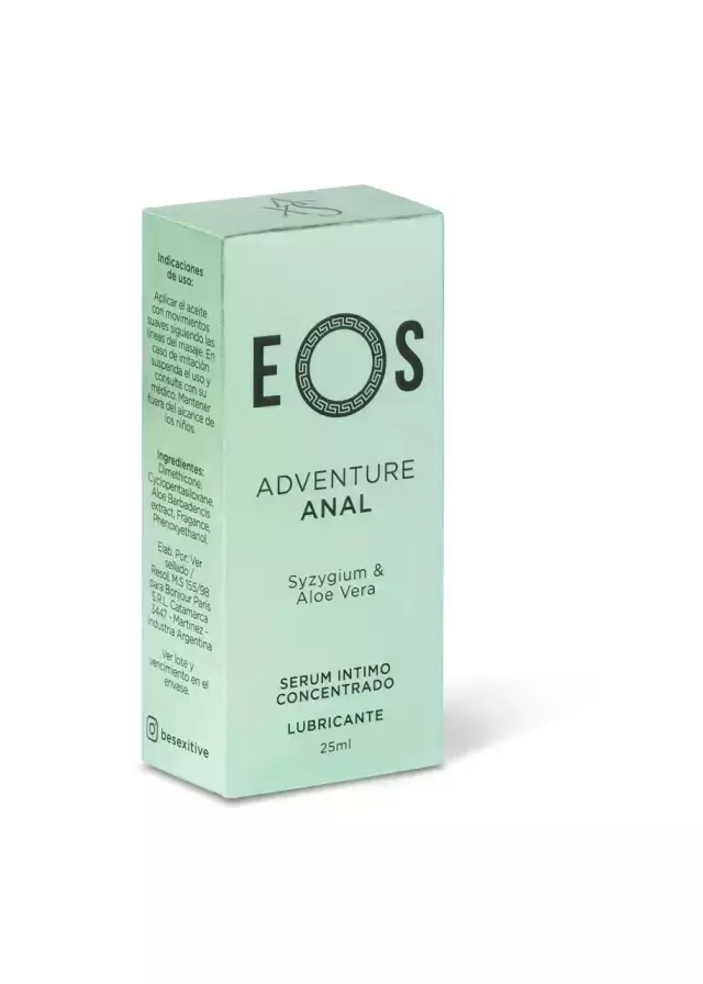 El serum concentrado EOS Adventure Anal es un lubricante anal de silicona unico, formulado con una mezcla de extractos naturales, incluyendo la potencia del clavo de olor y aloe vera. Esta formula especial proporciona una lubricación mas duradera, mejorando el deslizamiento y aumentando las sensaciones para una experiencia intima mas comoda y placentera